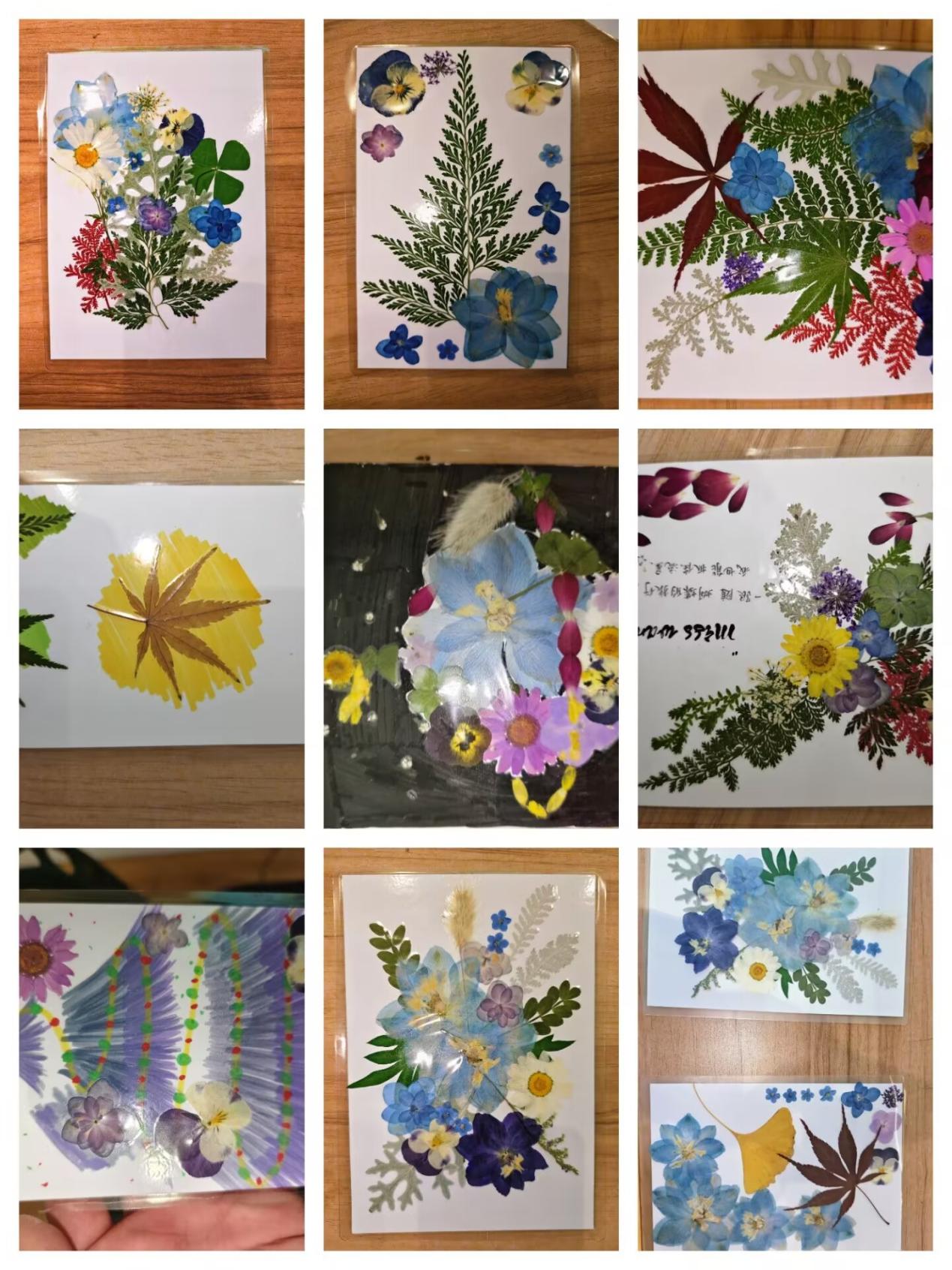 实践环节中,参与者或自主创作,或组队协作,充分发挥创意与审美:有人选用活动筹备的干花干叶,有人携带校园内采摘的普通植物,小心翼翼将植物素材粘贴在白卡纸指定位置,勾勒出独特的自然图景;不少参与者还在作品上写下对自然的感悟与美好寄语,让标本不仅有颜值更有温度。作品完成后,工作人员全程手动协助每一位参与者进行标本塑封,细致操作保障作品完好留存,让这份自然之美得以长久珍藏。活动尾声,所有参与者与自己的创意标本合影留念,专属作品均由参与者自行带走,定格这份手工乐趣与自然记忆。
