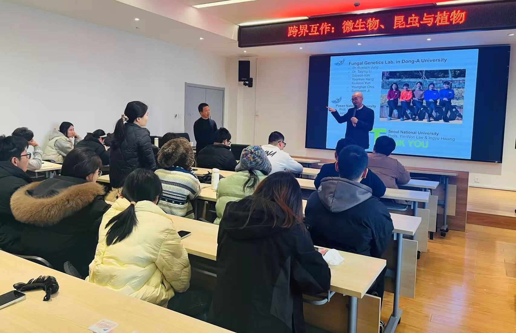 2025年12月29日下午,我院特邀韩国东亚大学著名生物学家Lee Jungkwan教授来访,并于学术报告厅举办题为《跨界互作:微生物、昆虫与植物》的前沿学术报告。报告会由桂仲争研究员主持,所院相关领域教师、研究生及本科生近100人参加。