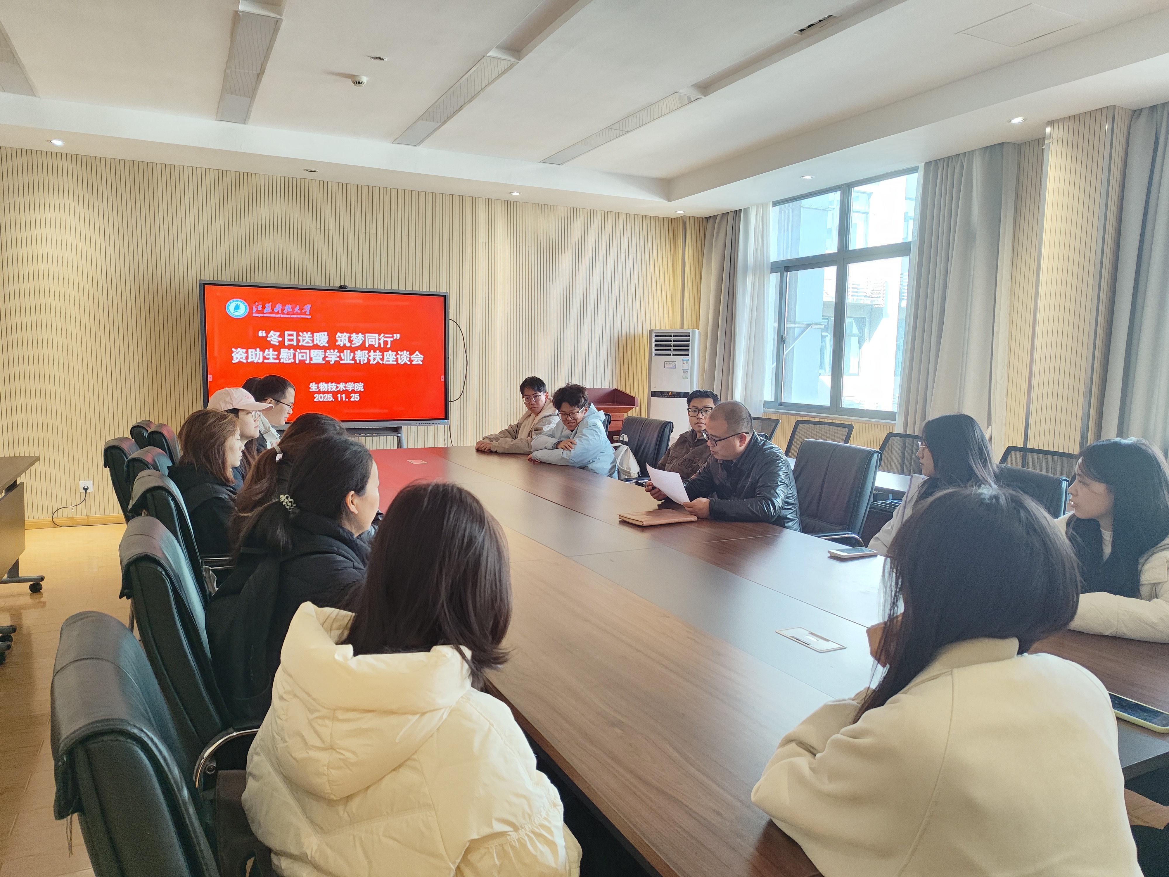 为深入推进发展型资助育人工作,总结资助生学业帮扶的阶段性成效,持续搭建互助成长平台,11月25日,生物技术学院以“冬日送暖、筑梦同行”为主题,举办资助生慰问活动暨结对帮扶座谈会。学院副书记唐亮、2023级辅导员吴道顺、资助辅导员陈舒眉及全体结对资助生代表齐聚一堂,让冬日暖意与互助力量交织,助力资助生全面成长。