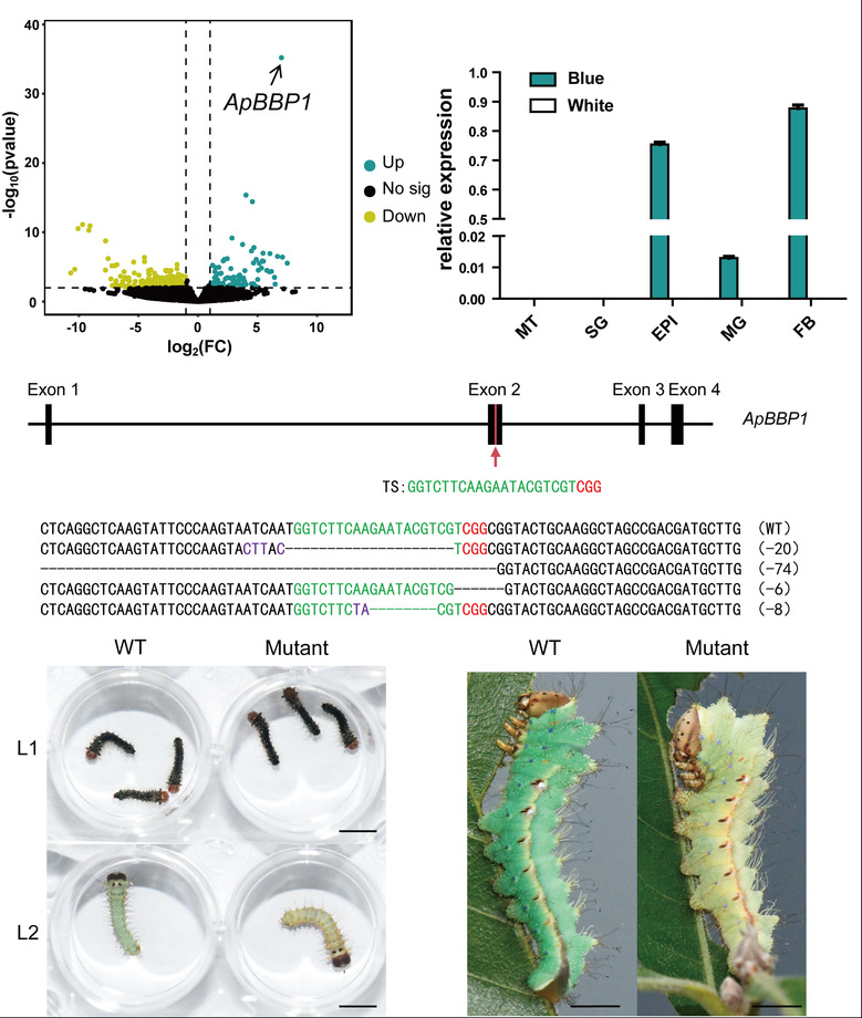 该研究通过对不同体色的柞蚕品系开展基因组和转录组学分析,在柞蚕中鉴定了6个胆绿素结合蛋白基因(ApBBP1-6)。其中ApBBP1基因在蓝色品系幼虫表皮中高度表达,而在白色品系中几乎完全不表达。基因组比较分析发现,相较于蓝色品系,白色品系的ApBBP1基因位点存在约3.9 kb的基因组序列缺失,导致蛋白编码序列提前终止。为了确认ApBBP1基因的功能,研究团队首次在柞蚕中建立了CRISPR/Cas9基因编辑体系,并在蓝色柞蚕品系中成功敲除了ApBBP1基因,结果显示敲除后幼虫表皮蓝色几乎完全消失。进一步的代谢组分析发现突变体幼虫表皮中的胆绿素含量显著下降。以上结果证明ApBBP1对胆绿素在表皮中的积累至关重要并直接决定了蓝色体色的形成。此外,分子对接分析结果表明,ApBBP1与胆绿素分子的结合能力明显高于其他同源蛋白,从而进一步证明单个胆绿素结合蛋白即可调控昆虫蓝色体色的形成。研究成果为理解昆虫体色多样性的进化机制提供了新线索,也为昆虫体色调控提供了技术手段,在昆虫遗传育种、生态进化研究等领域具有广泛应用前景。