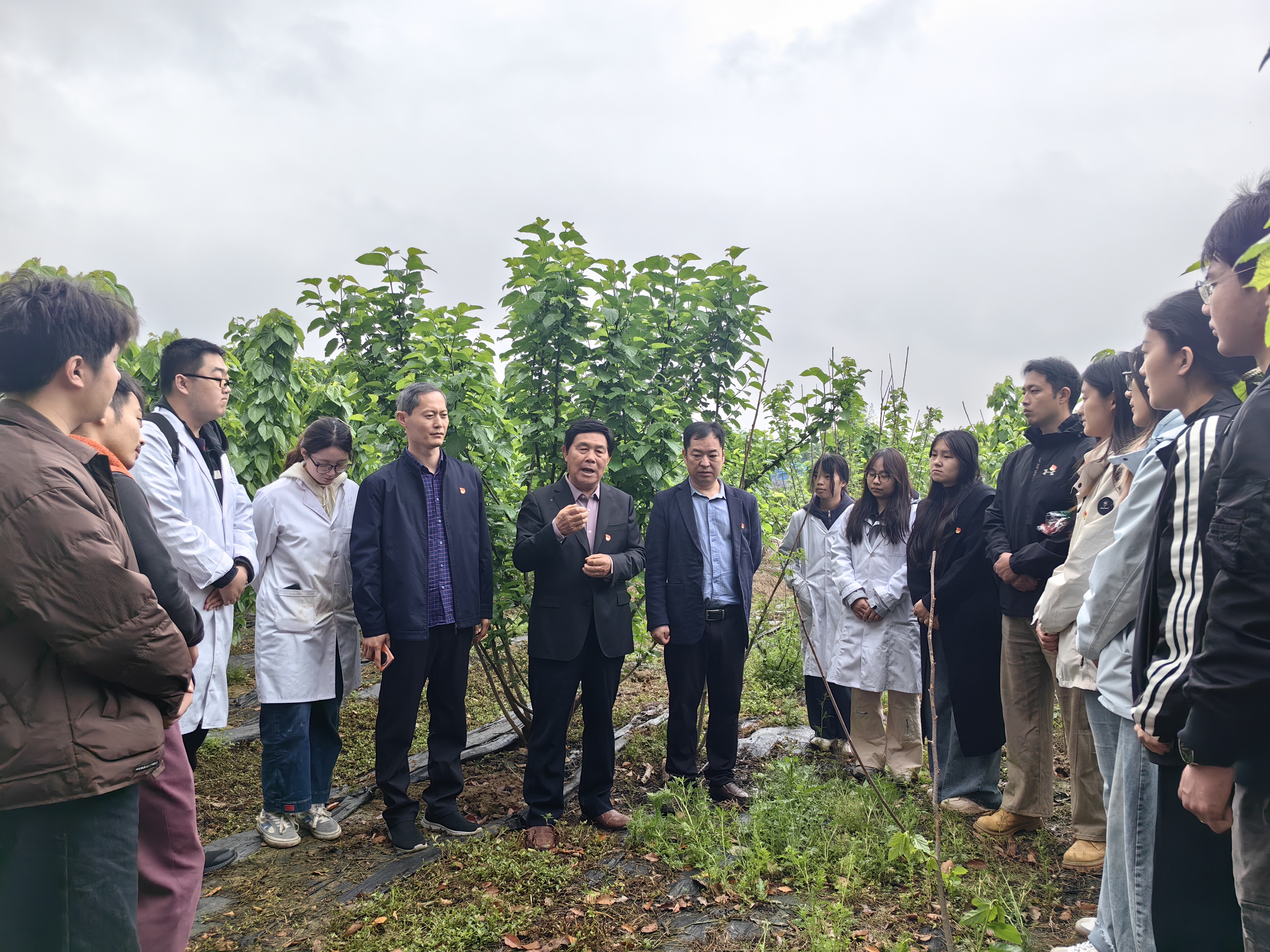 研究生第一党支部书记李刚讲解桑树新品种选育原理与生态种植模式,强调科研须扎根田间、回应产业痛点;科技小院首席专家赵卫国教授介绍“小院经济”赋能乡村振兴的实践路径,指出“科技成果只有转化为农民可学、可用、可推广的技术,才算真正落地”;溧阳市天目湖农业发展有限公司董事长夏安扣分享企业与高校协同育人实践成果——科技小院在溧阳“1号公路”沿线推广果叶两用桑新品种5000多亩,助农增收1亿多元,带领群众走出“特色富农”蚕桑新路径。75岁的夏安扣感慨道:“我一生只干一件事,就是留住江南蚕桑文化的根与魂。”党员们在桑园中聆听科技助农、产业兴农的鲜活故事,深刻理解产学研合作在推动乡村振兴建设中的关键作用。